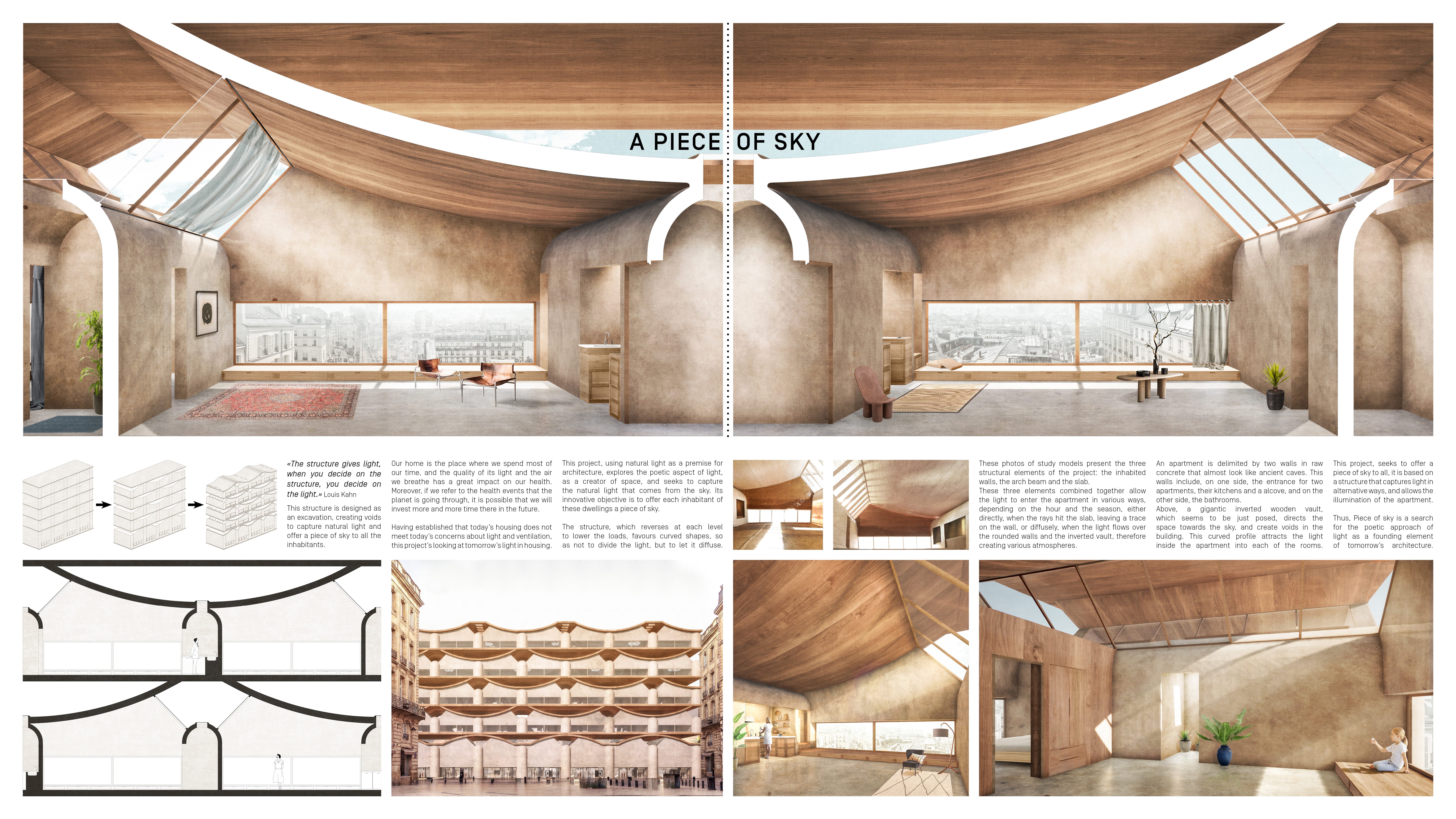 A PIECE OF SKY Our home is the place where we spend most of our time, the quality of its light and the air we breathe has a great physiological but also psychological impact on our health. Moreover, if we refer to the health events that the planet is going through, it is possible that we will invest more and more time there in the future, hence the importance of living in a pleasant place. Having established that today’s housing does not taking count of today’s concerns about light and ventilation, this project is looking at tomorrow’s light in housing. Today, many apartment buildings do not provide the necessary natural light, often toilets, bathrooms, and sometimes even kitchens do not have access to natural light or ventilation. Indeed, we have taken the task of lighting and ventilating these rooms to technology based on numbers, not feelings. We have based our approach to light solely on its mechanical and technical side. These sides are essential to the creation of pleasant living spaces, but they are not the only ones. This project, therefore, seeks to explore the poetic aspect of light, a light that reveals spaces and creates atmospheres. It is no longer enough to simply ask the question «how much lux does this room need?». But it is also necessary to ask «what kind of light does this room need?». To take care of all the qualities of light, a light poetic approach has to be included in projects. Its thermal and visual qualities, but also its sensory and emotional qualities. This project, using natural light as a premise for architecture, explores the relationship of light as a creator of space, and seeks to capture the natural light that comes from the sky. Its innovative objective is to offer each inhabitant of these dwellings a piece of sky. «The structure gives light, when you decide on the structure, you decide on the light». Louis Kahn. As Louis Kahn explains, space is the relationship between the structure that constitutes it and the light that animates it. So, when asked, «What kind of light does this room need?» We can answer it with another question, «What kind of structure does this room need?» This project, therefore, asks itself what kind of structure to adopt, and what shape it should take to capture the maximum amount of natural light and offer a piece of sky for everyone. A piece of sky is composed of three classic structural elements, which it adapts and transforms: the post, the beam and the slab. Each of these elements is worked in such a way as to bring light specifically into each room. Foremost, the posts are worked longitudinally, to design real inhabited walls. They are rounded at their ends, so as not to divide the light, but on the contrary, so that the light coats them and slides over them. An apartment is delimited by two walls, which include, on one side, the entrance for two apartments and their kitchens and on the other side, the bathrooms. Moreover, this project completely transforms the beams into gigantic inverted arches. Allowing, to capture the light from their empty interior, to redistribute it in a diffuse way inside the inhabited walls. Raised at its ends, the rounded beam calls for light, and depending on the time of day, makes it slowly flow along the walls or brings it directly into the space. This new emptiness, created by the beam between two apartments, makes it possible to offer this piece of sky to each inhabitant. And finally, the slab comes to rest on the beams, it allows the light to bounce and bounce back, thus accentuating the brightness of the apartments. Inside the apartment, the openings of the facades are placed at ground level, and at eye level, so as not to overpower the openings in the sky. This project, which seeks to offer a piece of sky to all, is based on a structure that captures light in alternative ways, and allows the illumination of each of the rooms that make up the apartment. Thus, Piece of sky is a search for the poetic approach of light as a founding element of tomorrow’s architecture.