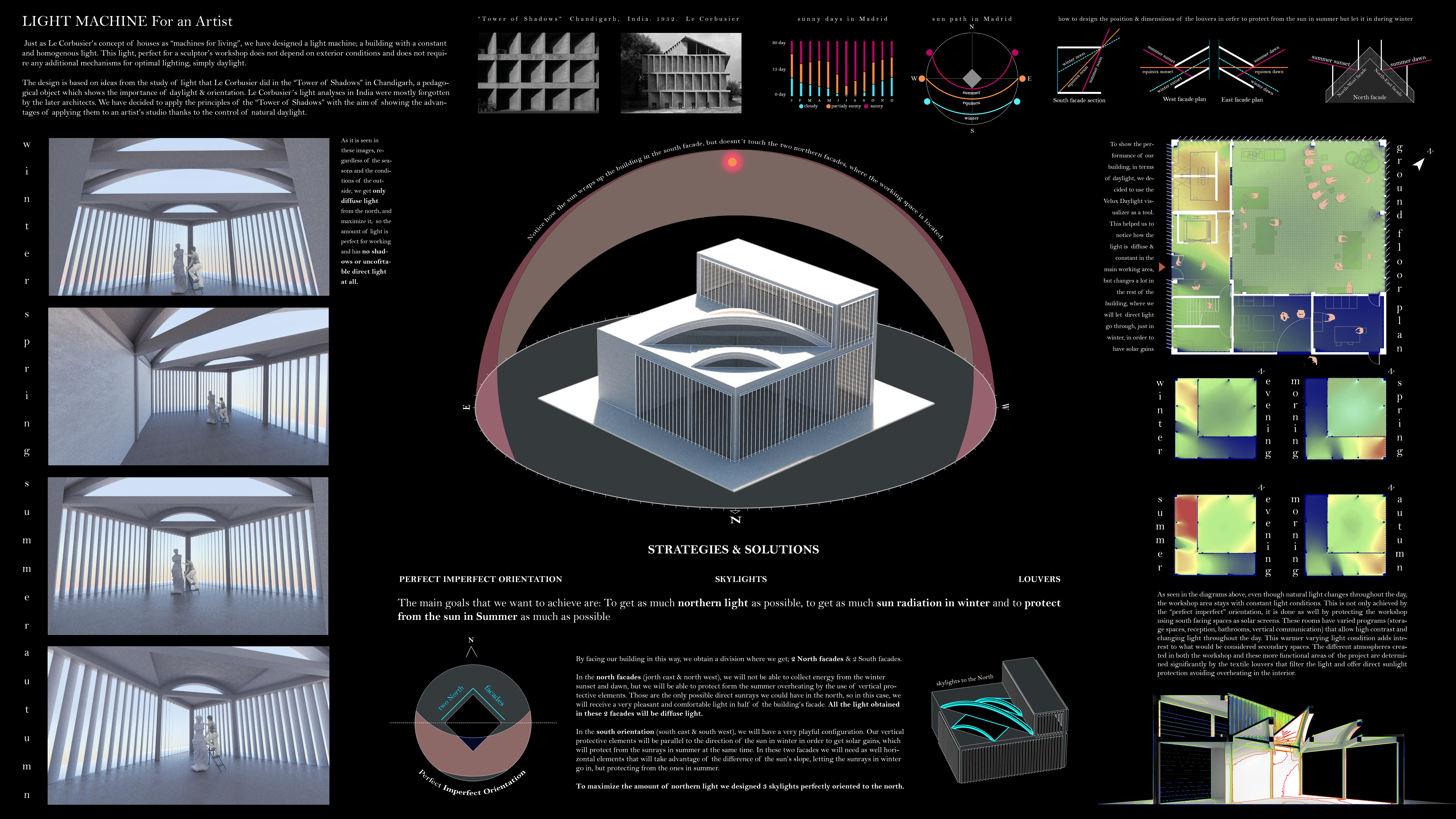 LIGHT MACHINE For an Artist Just as Le Corbusier’s concept of houses as “machines for living”, we have designed a light machine; a building with a constant and homogenous light. This light, perfect for a sculptor’s workshop, does not depend on exterior conditions and does not require any additional mechanisms, it functions on simply daylight. The design is based on ideas from the study of light that Le Corbusier did in the “Tower of Shadows” in Chandigarh, a pedagogical object which shows the importance of daylight & orientation. Le Corbusier´s light analysis in India were mostly forgotten by the later architects. We have decided to apply the principles of the “Tower of Shadows” with the aim of showing the advantages of applying them to an artist’s studio thanks to the control of natural daylight. Our building is located in Madrid, Spain, close to our university (Universidad Europea de Madrid) and is free of any surrounding, any tall or large structure, giving us the necessary freedom to experiment and play with daylight. We also must take into consideration that Madrid has a significant seasonal thermal oscillation passing from below freezing temperatures in the winter to more than 40ºC in the summer months, which leads to several design decisions that aim to use climatic conditions to create an optimal environment of lighting and temperature throughout the year for absolute comfort in the interior spaces. Madrid’s sunny climate, with almost 2700 hours of sunshine and clear skies, was the main challenge of the project. These conditions are the opposite of what the program requires, which is constant and diffused sunlight. As we are designing a sculptor’s workshop, having great control of the light is crucial. In the working area, large amounts of light are needed. Avoiding direct light to get in is of great importance, as it would create very uncomfortable working conditions and it could potentially damage the sculptures. Taking this into account, our main goals for this project are: - Getting as much diffuse light as possible in the main working area. - Getting as many solar gains as possible in winter & protecting it from the summer overheating. Therefore, our first decision was to place our building in a perfect-imperfect orientation following the form of a rhombus with its vertex oriented to the north. By positioning our building in this way, we obtain a division where we get; 2 North facades & 2 South facades. In the north hemisphere the light from the north is diffused as the sun’s path is in the south. For this reason, we have located our working space facing the north-east and north-west façade, taking advantage of this diffused and constant light. In the south-east and south-west direct sunlight is used during the winter for warming the interior space but avoided in the summer using solar protection.These solar protective elements (louvers) are carefully calculated using Le Corbusier’s reference of the “Tower of Shadows”, taking advantage of the changing solar angle with the seasons. In the North facades (North East & North West), we will not be able to collect energy from the winter sunset or dawn. However, we will be able to protect (it, the rooms, the structure, the interior, the working area) from the summer evening overheating with the use of vertical protective elements. These low-angle east and western rays are the only possible direct sunlight in the spaces facing the north. A very pleasant and comfortable light environment is created in this half of the building where all the natural light is diffused light. On the other hand, in the spaces facing the south (facades facing the south east & south west), we will have a very playful configuration. Our vertical protective elements are parallel to the direction of the winter sunset rays in order to get solar gains in the cold months, while simultaneously protecting the interior from direct sun during the summer. In these two facades, horizontal elements are used for solar protection. These have been designed to allow solar gains during winter months. To maximize the amount of northern light 3 skylights have been designed oriented to the north. Our structure will then be symmetric in the rhombus’s central axis in order to allow these arches to have a perfect north orientation despite the building’s imperfect orientation. The building’s program (storage spaces, reception, bathrooms, vertical communication) surrounding the working area in the south-east and south-west are indirectly used as solar screens that protect the artist’s studio from direct sunlight. This warmer varying light condition adds interest to what would be considered secondary spaces. Using all these strategies, our building provides the perfect light conditions for a sculptor. And as seen in the VELUX daylight visualizer 2, it works as expected, a truly accurate light machine.